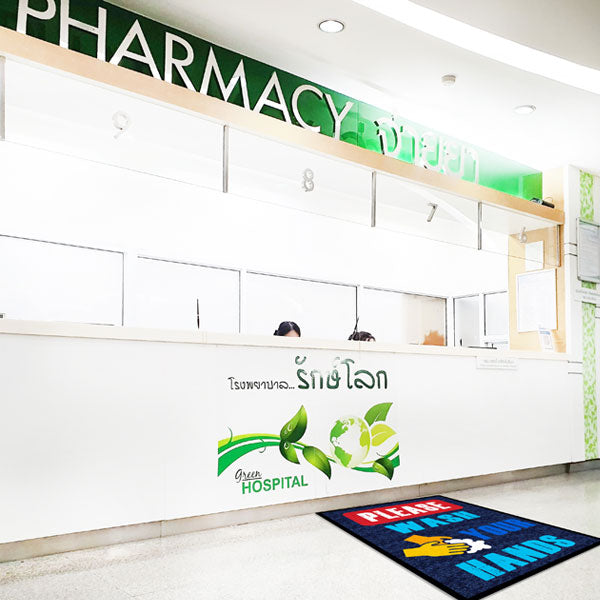 Printed rugs and reminders to "wash your hands" with dust and moisture trapping properties.